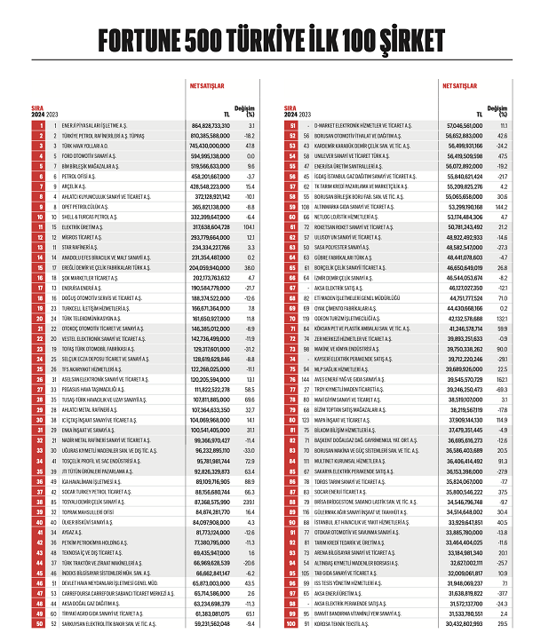 Bu yıl 18’incisi açıklanan, finansal kurumlar ve holdingler dışındaki tüm sektörleri kapsayan Fortune 500 Türkiye 2024 sıralamasında zirvedeki ilk üç değişmedi. Enerji Piyasaları İşletme, 864.8 milyar TL net satış geliriyle bu yılda listeye ilk sırada girerken, Tüpraş (Türkiye Petrol Rafineleri), 810.4 milyar TL satış geliriyle ikinci, 745.4 milyar TL net satış geliriyle THY (Türk Hava Yolları) üçüncü sıradaki yerini korudu. Yaklaşık 595 milyar TL net satış geliriyle Ford Otomotiv Sanayi, Fortune 500 Türkiye 2024 listesinde dördüncülüğe yükseldi. 519.6 milyar TL’lik net satış geliriyle BİM, bir önceki listeye kıyasla iki basamak tırmanarak Fortune 500 Türkiye 2024 listesine beşinci sıradan girdi. 2024 yılı net satış geliri 458.2 milyar TL olan Petrol Ofisi altıncı sırada listede yer alırken, 428.5 milyar TL net satış geliri ile Arçelik iki basamak tırmanarak Fortune 500 Türkiye 2024 sıralamasında yedinci sıradan girdi. Geçen yılki listede dördüncü sırada yer alan Ahlatçı Kuyumculuk, 372.1 milyar TL net satış geliri ile dört sıra gerileyerek Fortune 500 Türkiye 2024 listesinde sekizinci sıradan girdi. Opet 365.8 milyar TL net satış geliri ile dokuzuncu, Shell &Turcas ise 332.4 milyar TL net satış geliri ile Fortune 500 Türkiye 2024 listesinde 10’ncu sıradaki yerini korudu. Fortune 500 Türkiye 2024 sıralamasında yer alan ilk 10 şirket 5 trilyon 492 milyar TL net satış geliri ile toplam satışların yüzde 31.6’sını gerçekleştirdi.